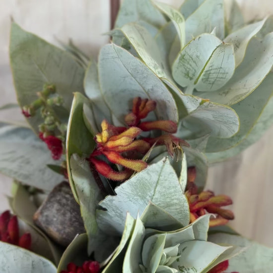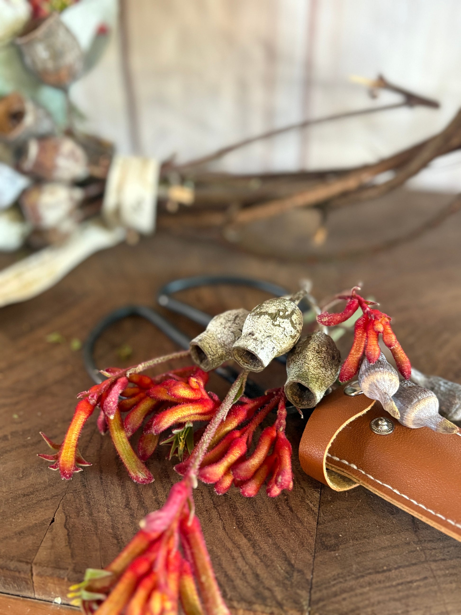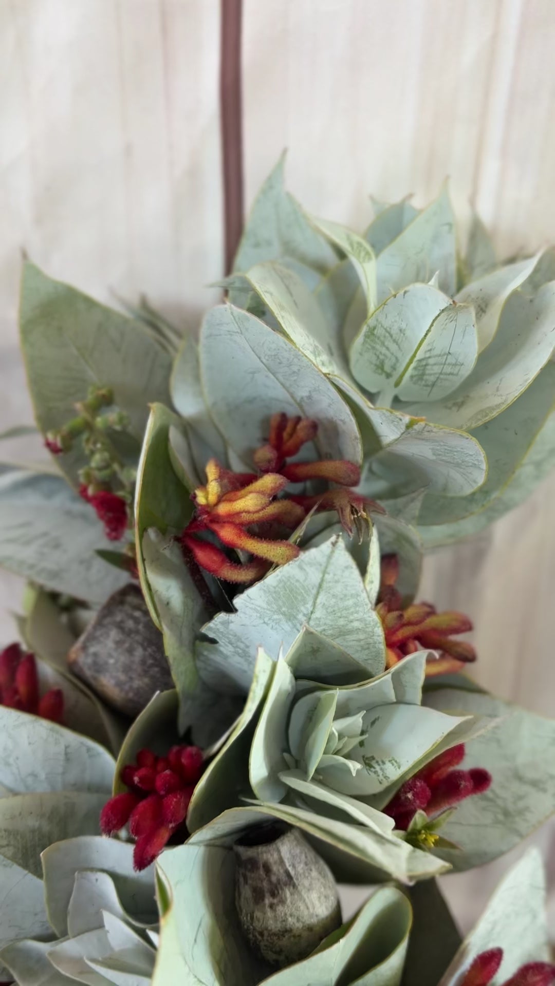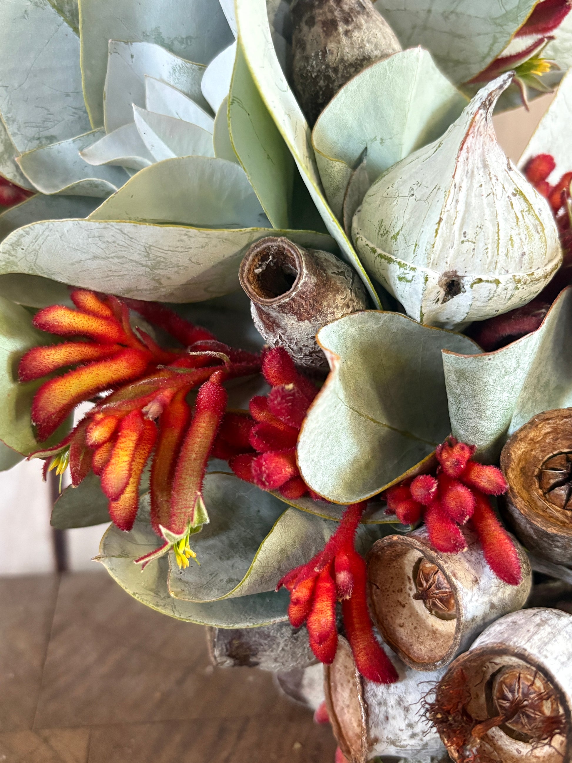 A striking wreath showcasing the bold textures of native Australian botanicals—macrocarpa, kangaroo paw, and bottle brush paired with gumnuts for authentic bushland character.