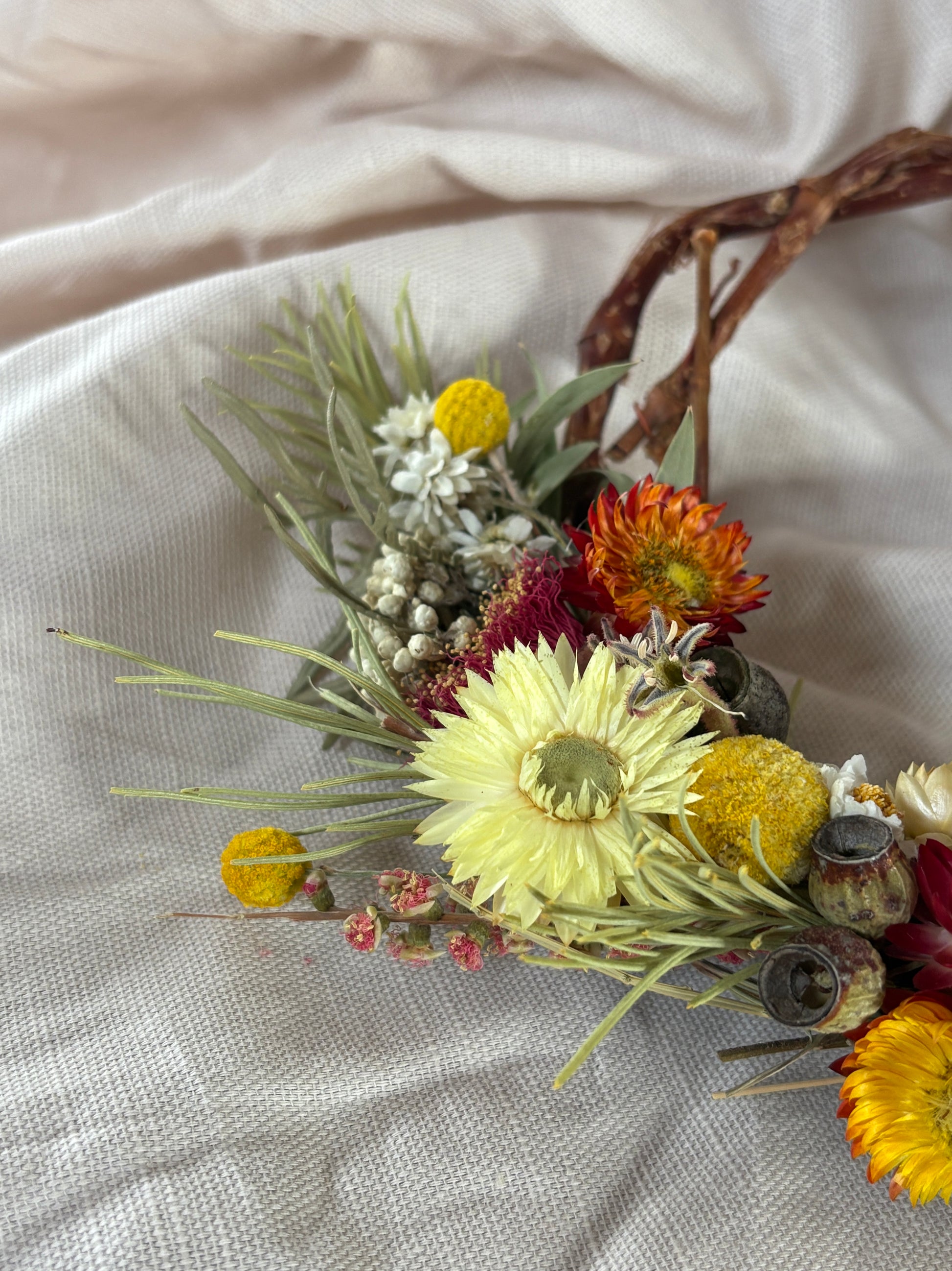 A beautiful, meaningful gift handcrafted on a natural grapevine base using sustainably dried native flowers from our bush garden.